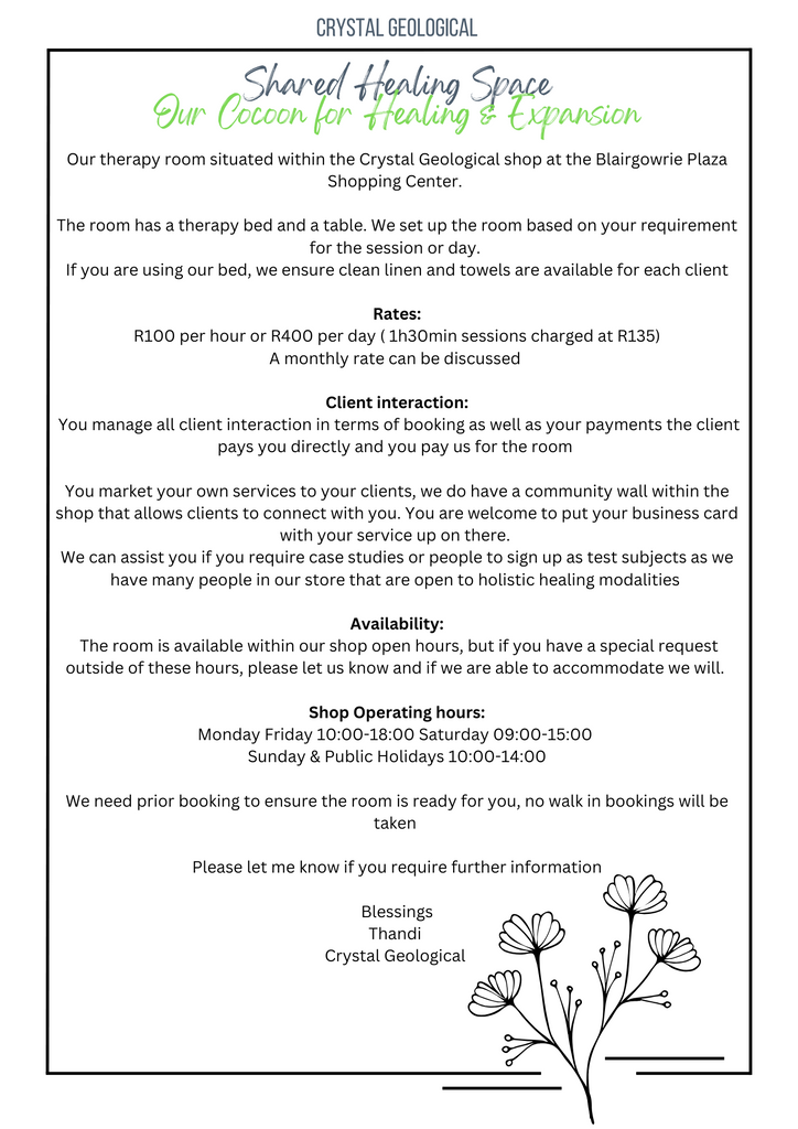 Our therapy room situated within the Crystal Geological shop at the Blairgowrie Plaza Shopping Center.